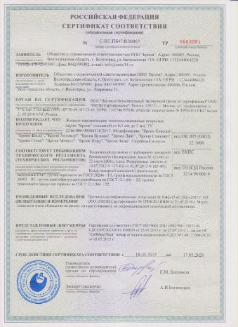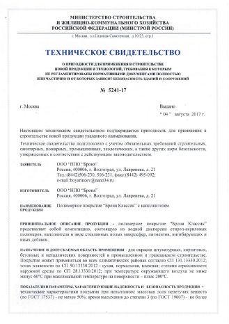 Обратите внимание. что «БРОНЯ» имеет расширенный сертификационный пакет: Техническое свидетельство МинСтрой РФ, Техническое свидетельство РБ, Газпромсертификация, Мосстройсертификация, Российский морской регистр судоходства, ИСС «НЕФТЕГАЗ ЭНЕРГОЭКСПЕРТ», ГОСТ Р, Сертификат пожарной безопасности, Санитарно-эпидемиологическое заключение и др.
